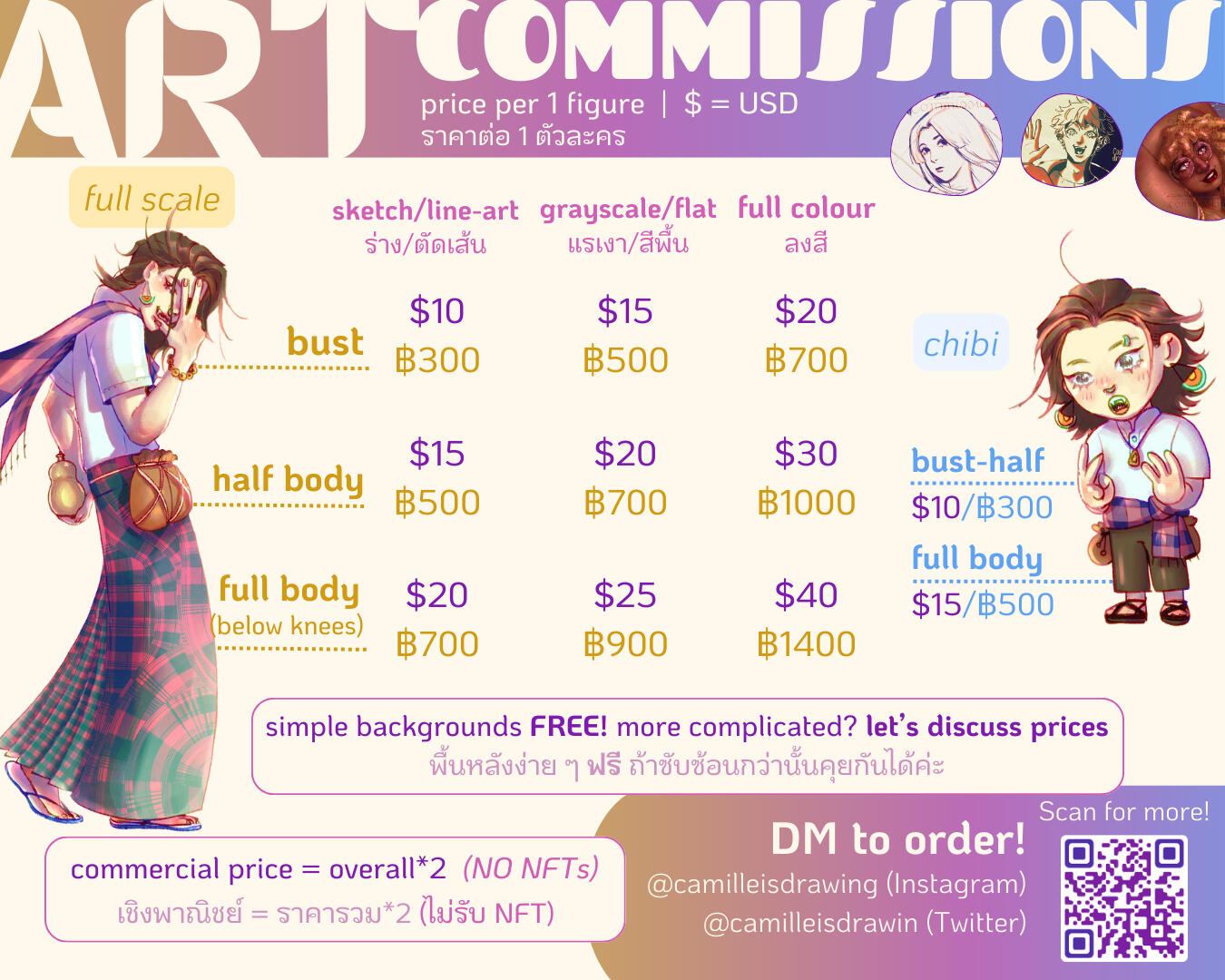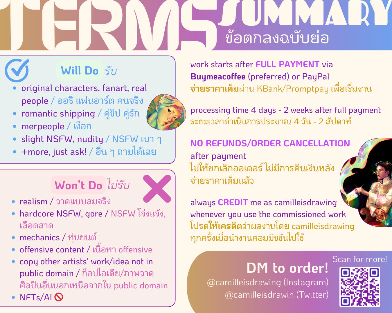 1. Once I approve your briefing, I will calculate your payment. I will only start working on the commission once I receive the FULL PAYMENT via Buymeacoffee📣Update 5 Aug 2024: Due to frequent scamming risks and the personal account on Paypal having trouble receiving payments, I will no longer accept payments via Paypal. For International customers, please pay with any of your payment method choices available on Buymeacoffee.🍵🙏2. NO REFUNDS/order cancellation after the full payment, please consider your order thoughtfully.3. First come, first serve. Processing time per queue is around 4 days - 2 weeks after full payment is received. Please inform me in the briefing if you have a DEADLINE.4. For a full-colour piece, I will send you watermarked progress of the work for you to check in 2 stages: the sketch/line art and the coloured art. These are the times you will be able to make changes or corrections.5. The final full-sized un-watermarked artwork will be delivered in .png/.jpg/.pdf/.psd (single layer), whichever of these file types you choose, through Google Drive/Onedrive. Please SAVE the commissioned work to your device.6. You must always CREDIT me whenever and wherever you use the commissioned work (as camilleisdrawing is ok 👍) BUT DO NOT USE MY ART FOR NFTs OR GENERATIVE AI.